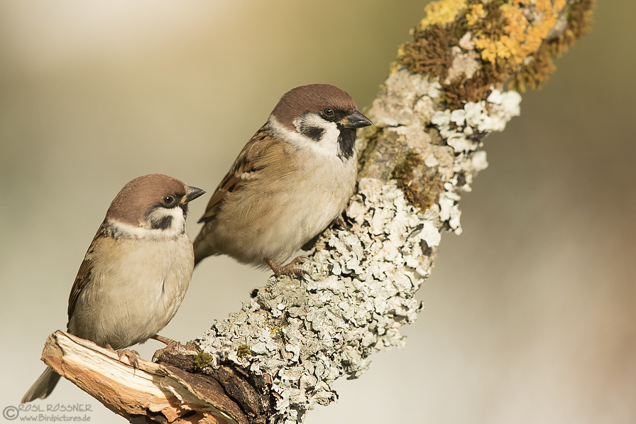 Während man beim Haussperling Männchen und Weibchen deutlich unterscheiden kann, sehen beim Feldsperling beide Geschlechter gleich aus. Zu erkennen sind die Feldsperlinge deutlich an der weißen Wange mit dem schwarzen Fleck darin. Ausserdem haben sie im Vergleich zum Haussperling, der einen garuen Oberkopf hat, einen rotbraunen Scheitel.