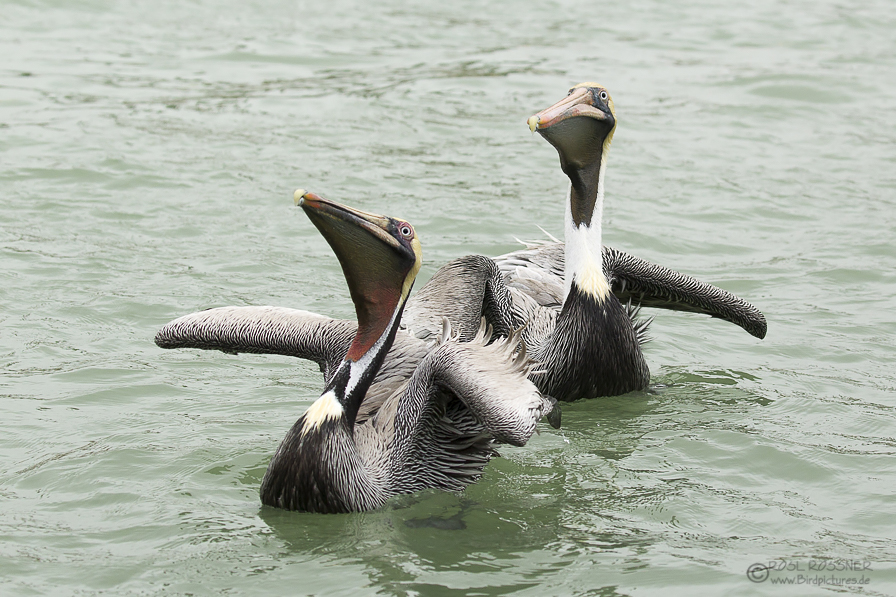 In Texas verbrachten wir einige Zeit mit den Braunpelikanen. Meine Begleiterin Ruth Hoyt hatte Fisch besorgt und die Pelikane wussten das ganz genau... Während die braunen Jungvögel leicht zu erkennen sind, muss man für die weitere unterscheidung genauer hinsehen: im Schlichtkleid tragen die Pelikane einheitlich weiss am Hals, während der Brutsaison werden Gesicht, Nacken, Hals und Kehle deutlich bunter!