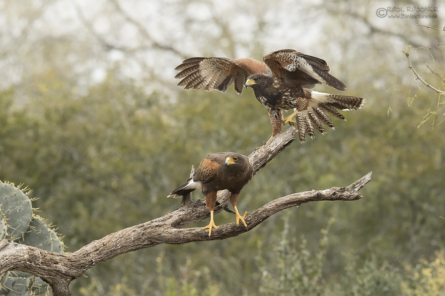 Wüstenbussarde kennt man hier vor allem, weil sie sehr unkomplizierte Vögel sind, die sich in vielen Falknereien in der Flugshow präsentieren. Ihre Natur ist es, in der Gruppe zu jagen und somit können sie auch in den Vorführungen als Gruppe arbeiten und gezeigt werden. In Texas findet man die Wüstenbussarde in freier Natur. Während die Altvögel relativ gleichmäßig dunkelbraun sind, haben die Jugendlichen ein bunteres Gefieder. Dadurch erkennen die Altvögel, dass es sich um Vögel handelt, die noch nicht geschlechtsreif sind und die ihnen ihr Brutrevier nicht streitig machen. Somit wird es für die Jungvögel leichter zu jagen und sich in aller Ruhe ein revier zu suchen, das nicht besetzt ist. Wären sie schon ausgefärbt, würden sie während der Brutzeit mehr Steitigkeiten mit den Brutpaaren bekommen.