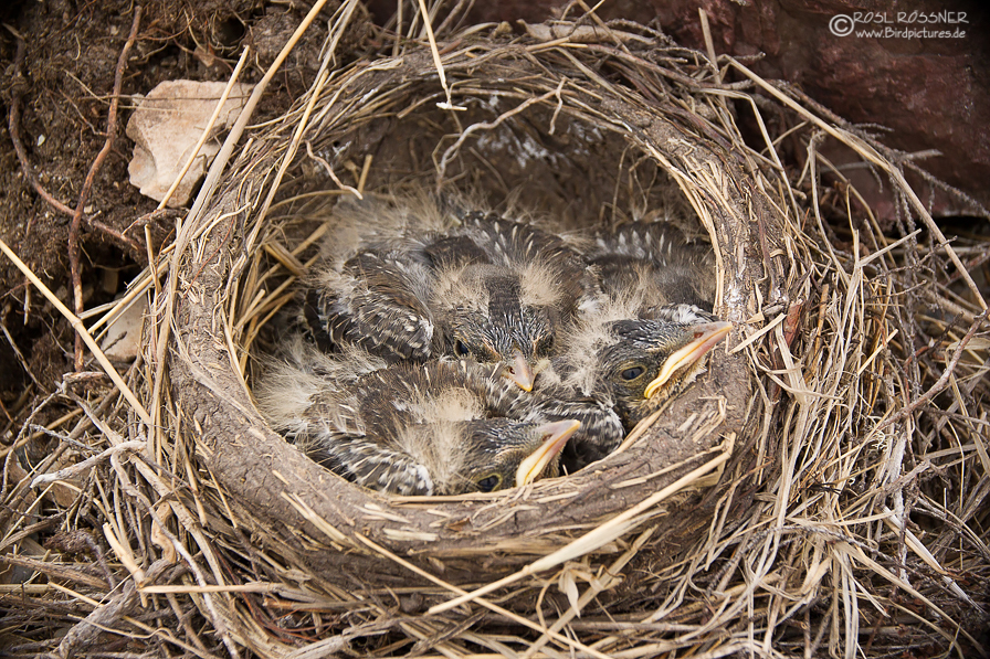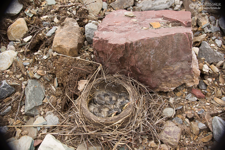 Ich war einigermaßen überrascht, als ich in Norwegen dieses Nest einer Wacholderdrossel entdeckt habe, besser gesagt bin ich fast darüber gestolpert... Es war direkt am Boden an einen kleinen Felsblock gebaut. Nur die aufgeregten Elternvögel haben mich darauf aufmerksam gemacht. Ein ähnlich angelegtes Nest habe ich an einem anderen Ort gefunden, das war sogar ganz offensichtlich mitten auf einem Stein gebaut. Erstaunlich, dass die Drosseln so wenig Sorge davor haben, dass ihre Jungvögel Räubern zur Beute fallen. Die vielen flüggen Jungvögel, die ich gesehen habe, sprechen aber dafür, dass die Strategie aufgeht.
